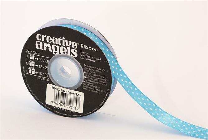 Saténová stuha, 15 mm x 22 m, svetlomodrá s bielymi bodkami