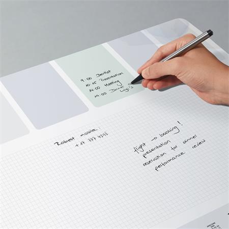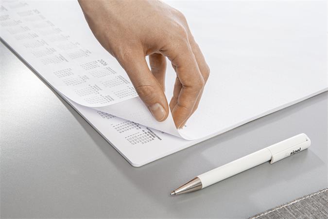Vysokokvalitná písacia podložka na stôl vyrobená z papiera s gramážou 80 g/m² a pevnou zadnou stranou. - s 3-ročným kalendárom (2026/2027/2028) - s týždenným plánovačom - štvrojazyčná: angličtina, nemčina, francúzština a holandčina - veľkosť: približne A2 - vegánsky produkt - zaoblené rohy - 30 listov - certifikovaná FSC