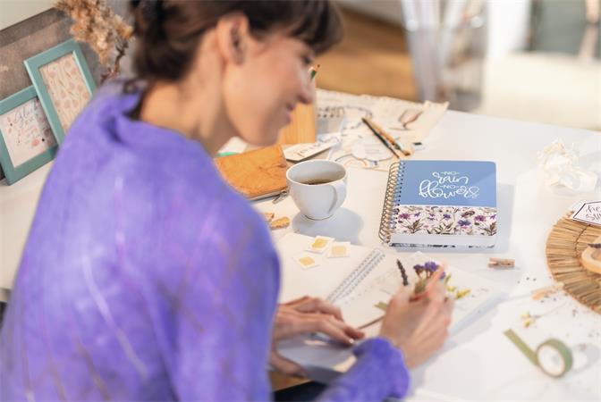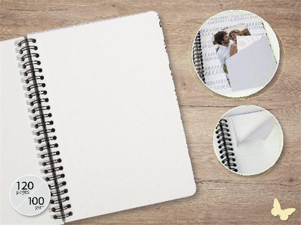 Špirálový zošit s tvrdou obálkou, s motívom Ginko -matný motív -čierna špirálová väzba -mikroperforované listy -120 bodkovaných strán -100 g biely papier -vrecko na zadnej stane obalu -FSC certifikát -vegánsky produkt