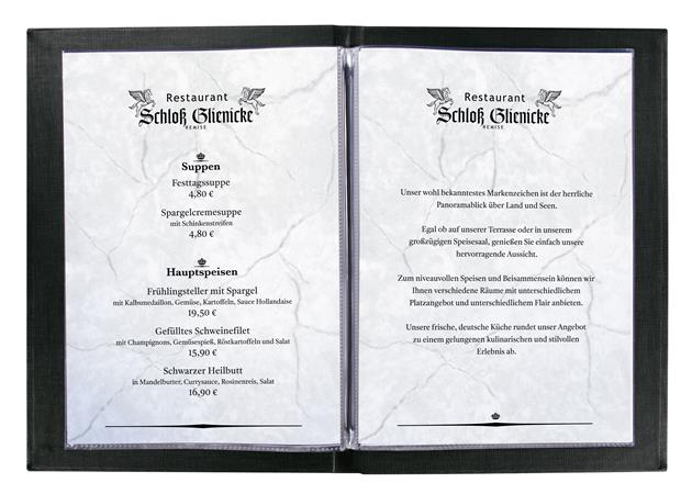 Kvalitný obal na jedálny lístok, ktorý nikdy nevyjde z módy. -formát A4 -rozmery: 210 x 297 mm -medzinárodný nápis na obálke: „Menu“ -dokumenty sa dajú ľahko vkladať a vymieňať -viazanie pomocou gumičky -ľahko sa čistí -odolný PU materiál -materiál odolný voči oderu a poškriabaniu -obsahuje 2 priehľadné puzdrá – na 8 strán (ďalšie náhradné puzdrá dostupné pod číslom produktu SISM180)