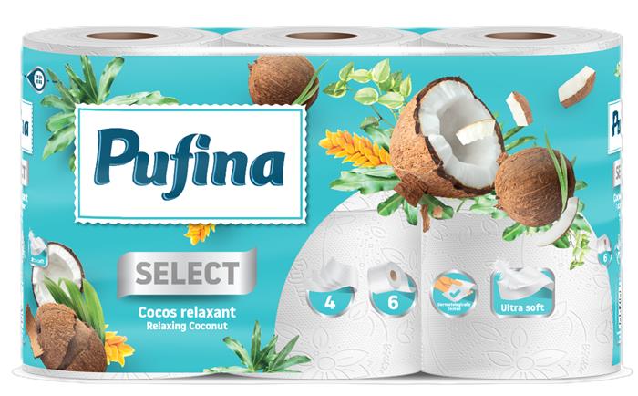 Toaletný papier, 4 vrstvový, malé rolky, 6 roliek, PUFINA "Relaxing Coconut", s kokosovou vôňou
